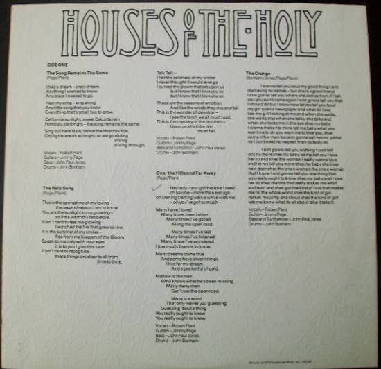 I do not own anything. The song remains the same, the rain song, over the hills and far away, the crunge, dancing days, d'yer mak'er, no quarter, the ocean. Speak to me only with your eyes. Houses of the holy 1973.